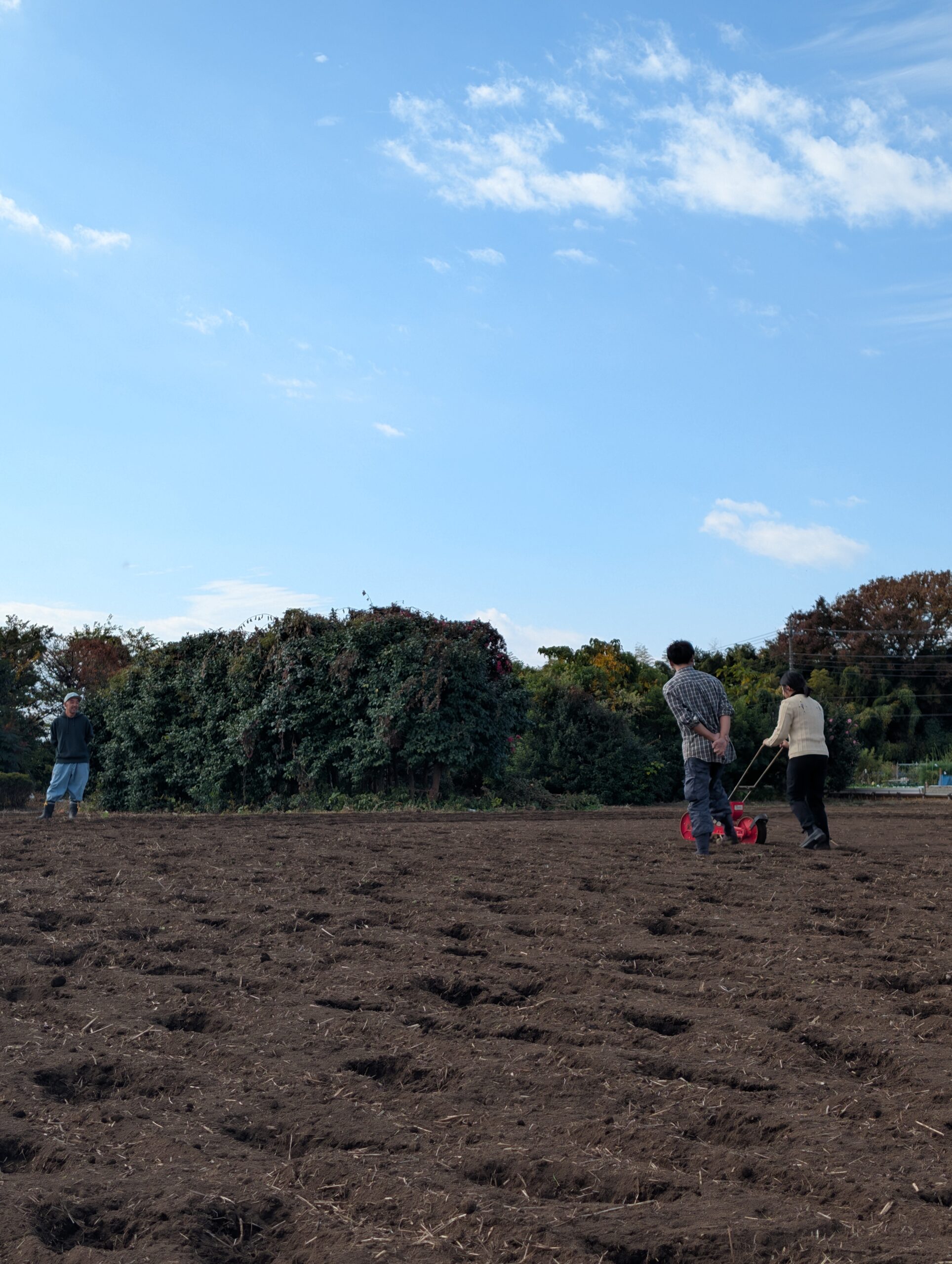 11月秋晴れの中、ふかふかの土に触れ、踏みしめ、コロコロと手押しの麦まき機で ユメシホウ小麦を撒いていきます。